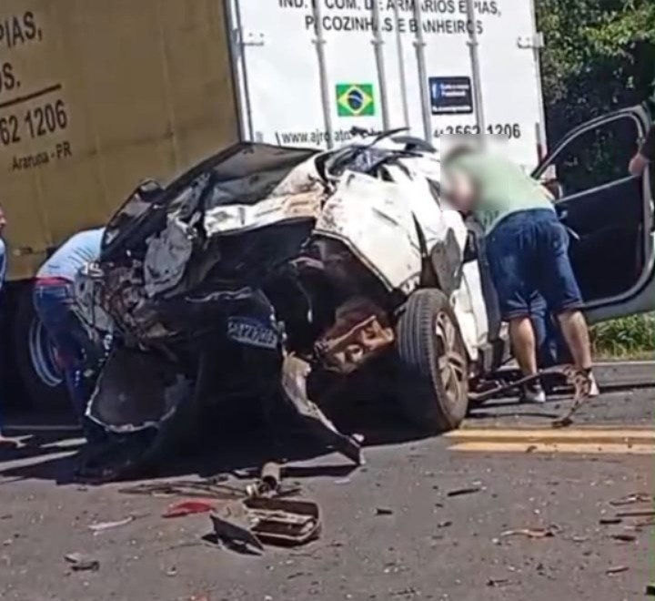 Veículo completamente destruído após acidente envolvendo caminhão e três veículos na BR-163, entre Naviraí e Juti. Foto: Direto da Rua
