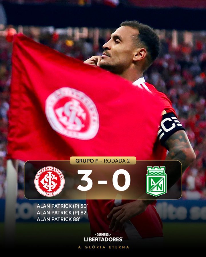 Contando com uma grande atuação do meia-atacante Alan Patrick, o Internacional derrotou o Atlético Nacional (Colômbia) por 3 a 0, na noite desta quinta-feira (10) no estádio Beira-Rio, em Porto Alegre, para assumir a liderança do Grupo F da Copa Libertadores.