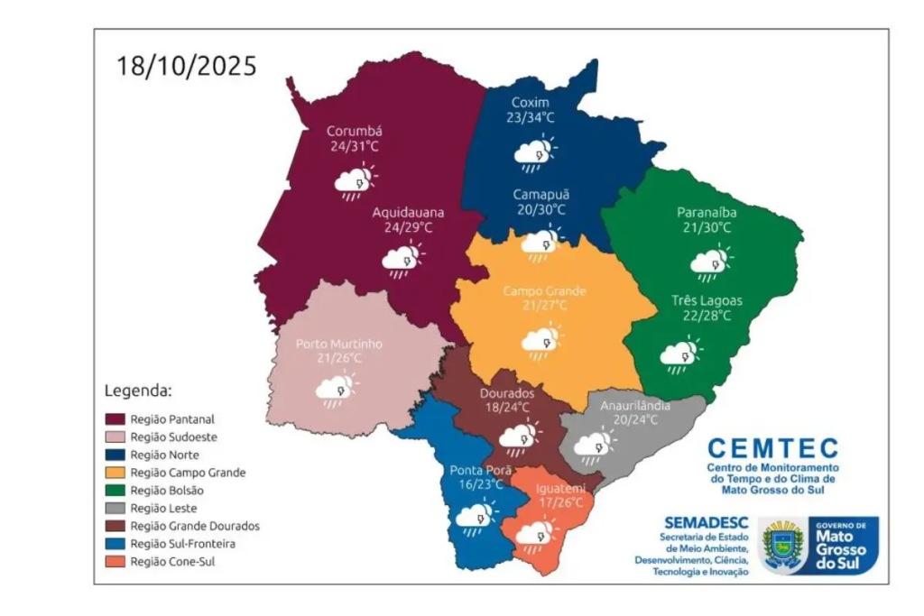Neste sábado (18), o dia amanheceu chuvoso em Campo Grande, com mínima de 21°C. A máxima não deve ultrapassar os 27°C. A mesma situação acontece em Porto Murtinho e Três Lagoas.
