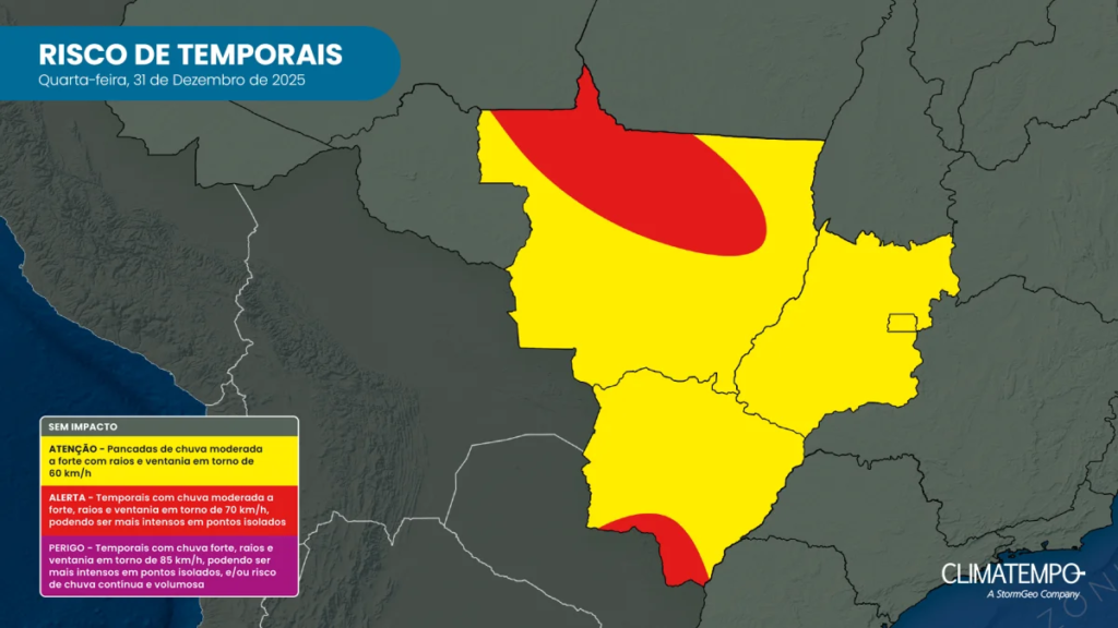 Confira abaixo, o mapa com o risco de temporais em Mato Grosso do Sul: