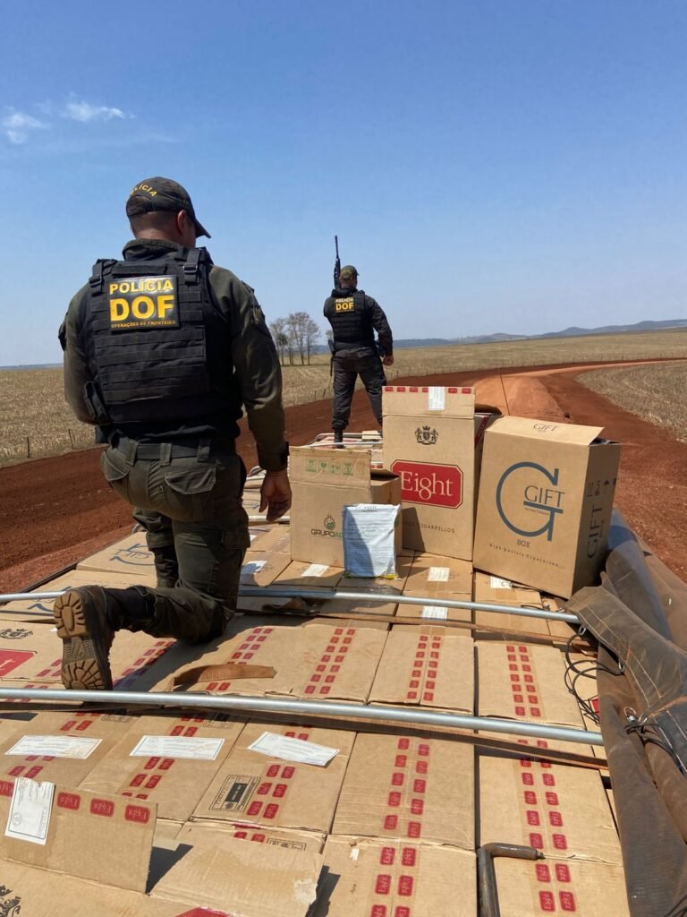 Policiais militares do DOF (Departamento de Operações de Fronteira) apreenderam, na tarde desta quinta-feira (18), na MS-164 em Maracaju, uma carreta Scania carregada com mais de 30 mil pacotes de cigarros e 25 caixas de defensivos agrícolas contrabandeados do Paraguai. Um homem de 30 anos foi preso em flagrante.