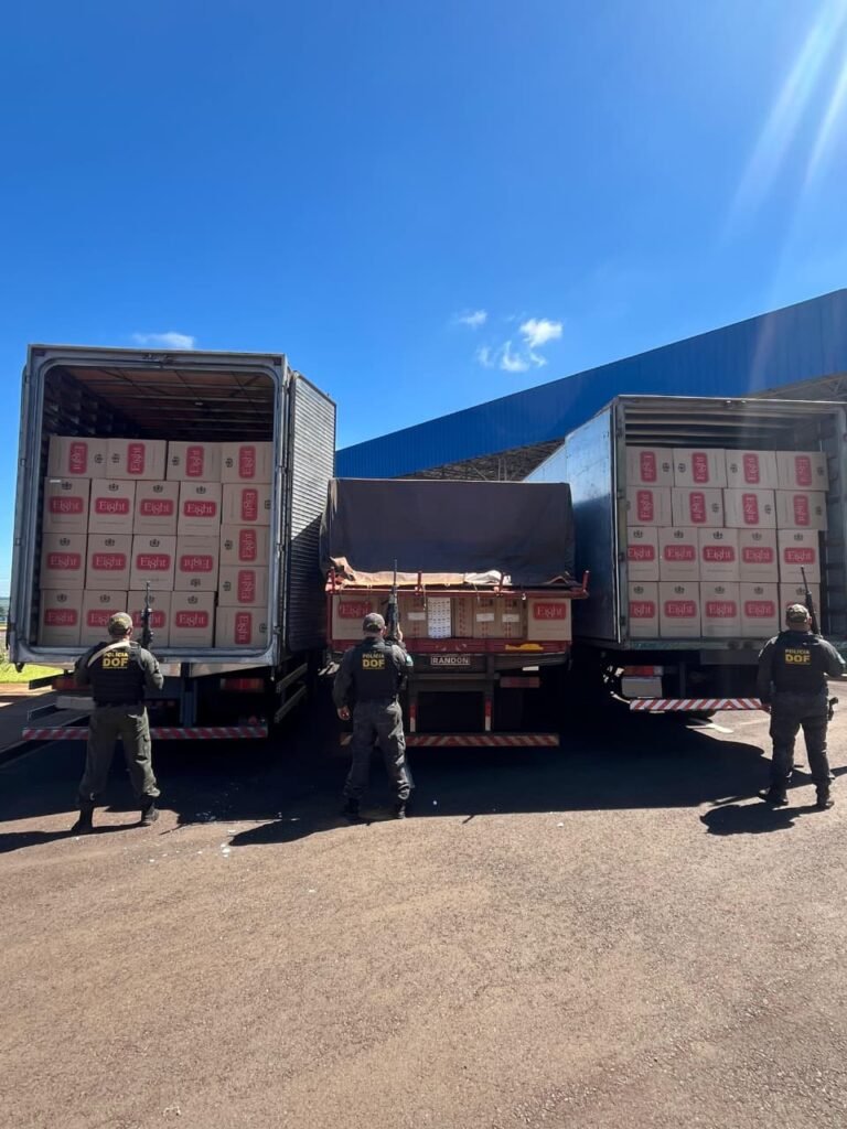 Policiais militares do DOF (Departamento de Operações de Fronteira) apreenderam, nesta terça-feira (25), em uma chácara próxima à BR-163, em Mundo Novo, dois caminhões Mercedes-Benz e um caminhão Iveco carregados com 45 mil pacotes de cigarros contrabandeados do Paraguai.