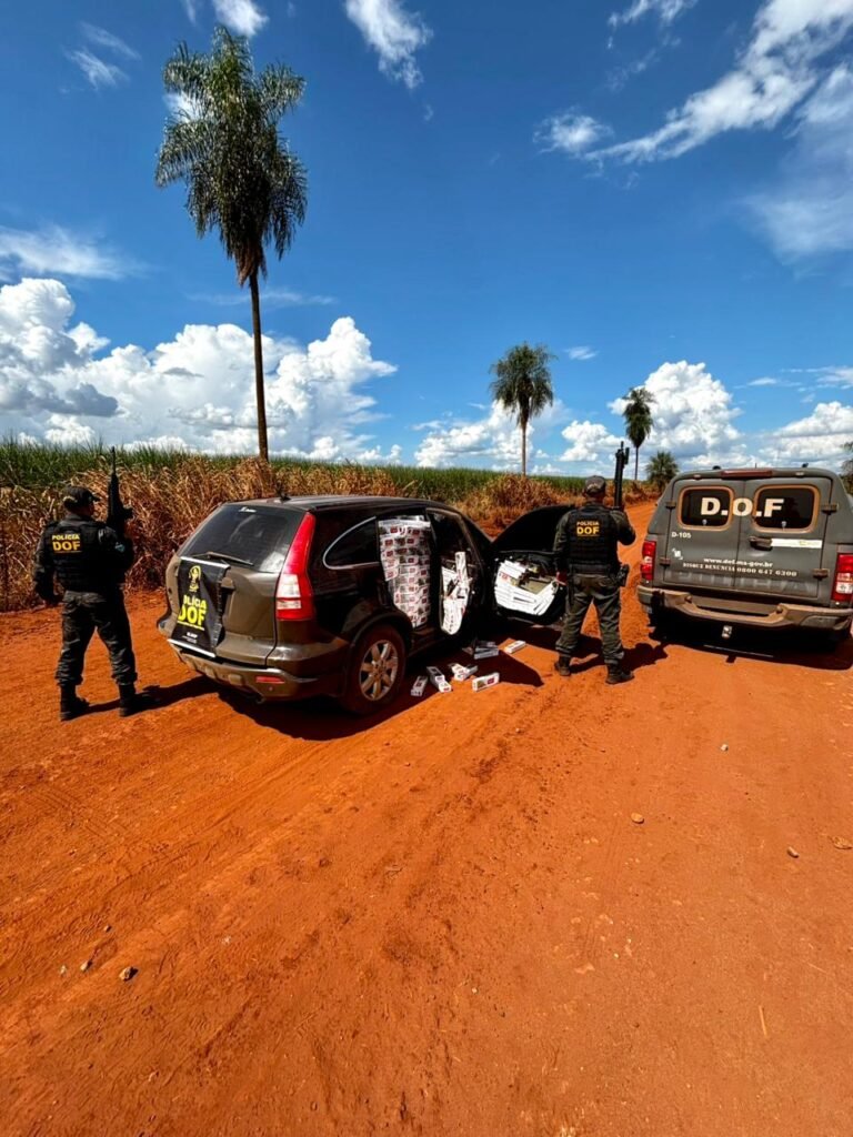 Policiais militares do DOF (Departamento de Operações de Fronteira) apreenderam, na tarde de domingo (8), um veículo Honda CR-V carregado com 50 caixas de cigarros contrabandeados do Paraguai. A ação ocorreu na rodovia MS-465, conhecida como Estrada do Suez, na região de Rio Brilhante.
