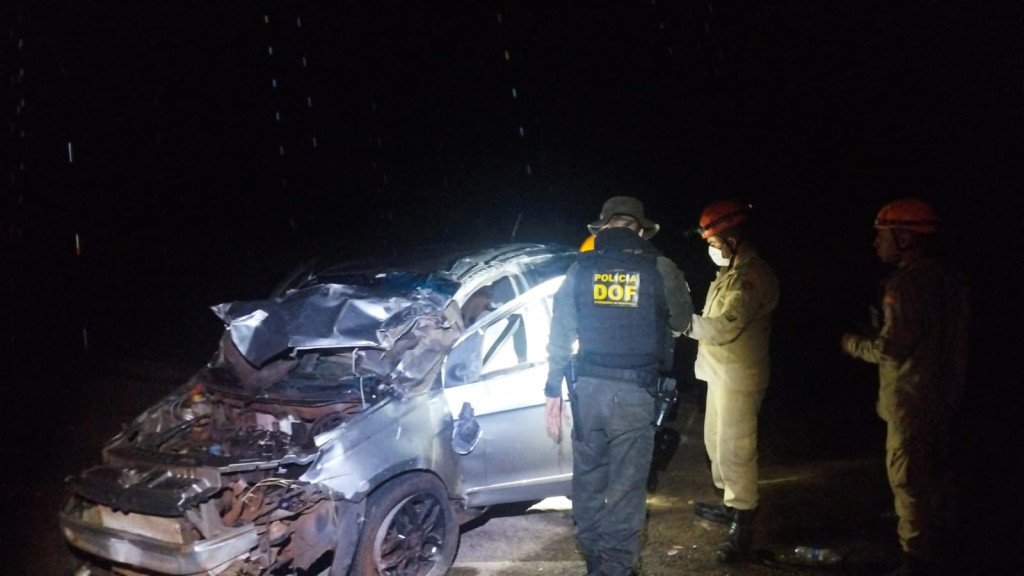 Policial do DOF e bombeiros ao lado do carro que capotou na BR-463 (Foto: Leandro Holsbach)