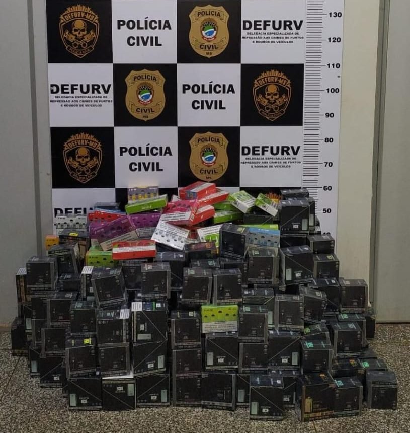 Diante disso, foi realizada a abordagem, ocasião em que se confirmaram as adulterações das placas por meio de uso de fita isolante. Na caçamba do veículo foram encontrados diversos cigarros eletrônicos, produtos de descaminho.