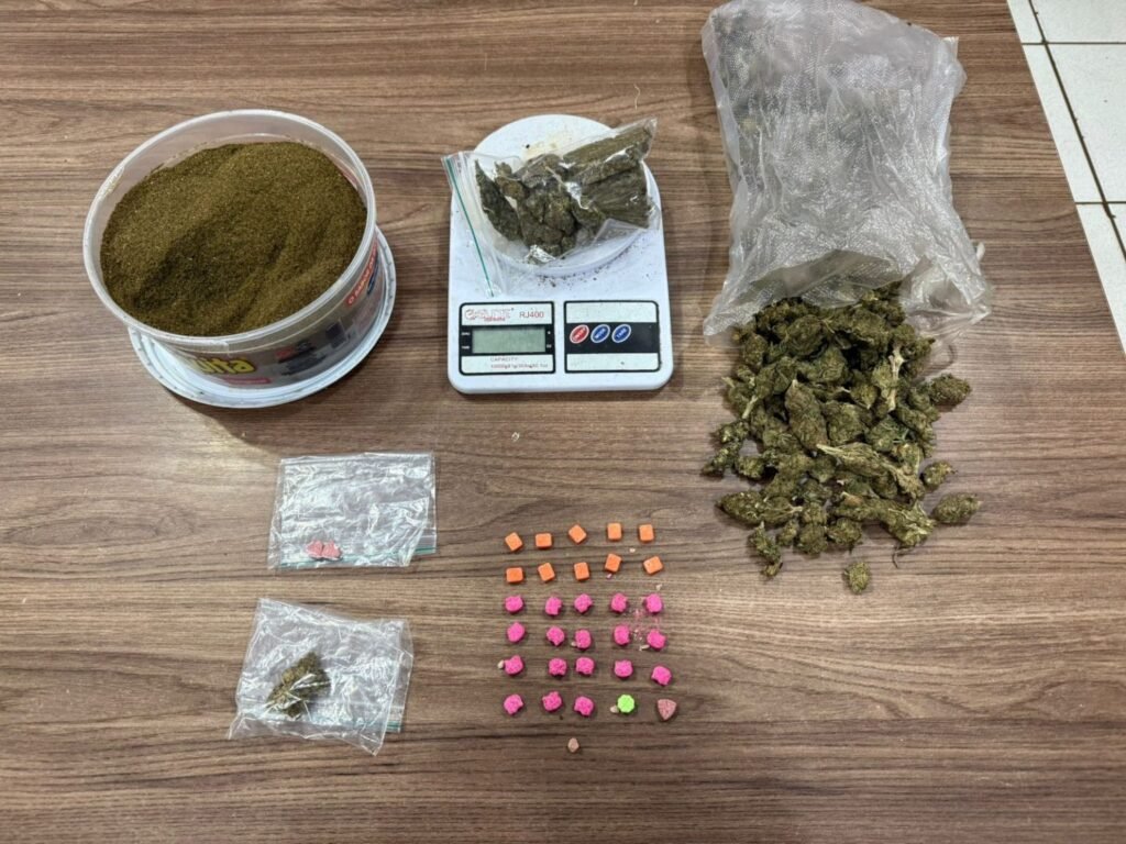 No interior do imóvel, foram apreendidos dois sacos com maconha, um pote com maconha triturada (utilizada para produção de skunk), comprimidos de ecstasy, uma balança de precisão e um celular. Ao todo, foram apreendidos 600 gramas de maconha e 14 gramas de ecstasy.