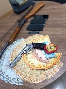 Durante o cumprimento dos mandados, o pai do autor, A.S.M., de 62 anos, tentou quebrar o próprio celular para destruir possíveis provas digitais.Ele foi autuado em flagrante por posse ilegal de arma de fogo e fraude processual, após os policiais localizarem no imóvel duas armas calibres .28 e .22, dezenas de cápsulas, R$ 6.800,00 em espécie, aparelhos celulares e uma caminhonete Hilux, que será periciada.