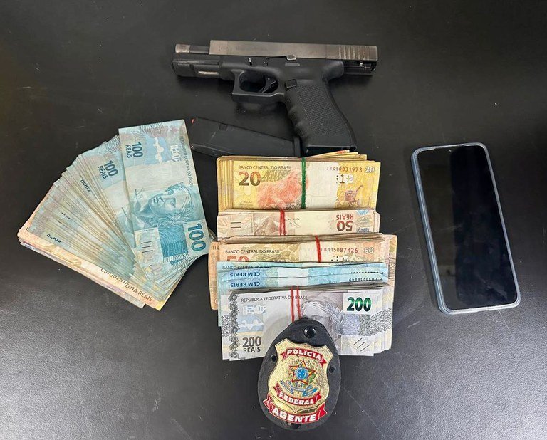 Durante a abordagem e busca pessoal, os policiais federais encontraram uma arma de fogo calibre 9 mm com a numeração suprimida, que estava na cintura do foragido.