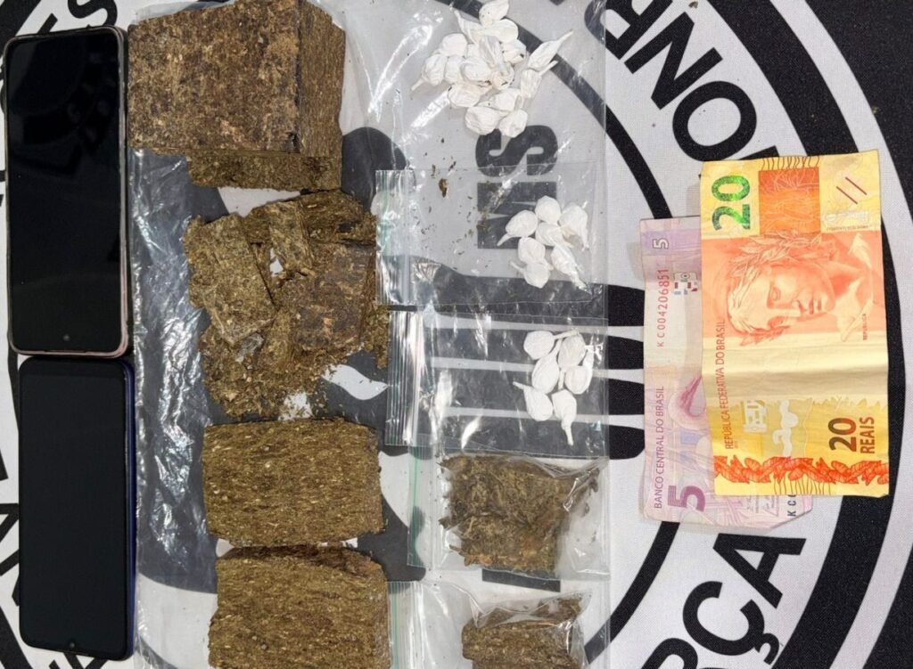 Durante a abordagem, foram encontradas duas porções de maconha já fracionadas no bolso da bermuda do investigado. Em continuidade às diligências, no interior do imóvel foram localizados 1 pote contendo maconha e ainda 33 porções de cocaína, todas embaladas e prontas para a revenda.