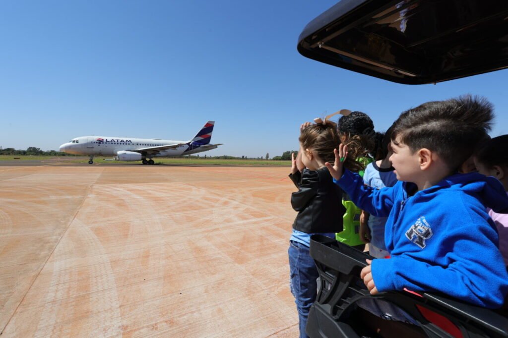 O brilho nos olhos dos alunos da Rede Municipal de Ensino começou já no trajeto até a pista de pouso e decolagem, e ganhou ainda mais intensidade ao avistarem de perto a imponente aeronave A319, Airbus da Latam Airlines. A admiração e a curiosidade tomaram conta do grupo.