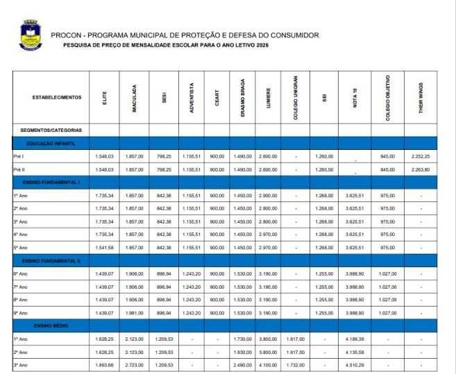 A Prefeitura de Dourados, por intermédio do Programa Municipal de Proteção e Defesa do Consumidor (Procon), realizou levantamento dos valores das mensalidades escolares para o ano letivo de 2026. A pesquisa foi feita em doze instituições de ensino da cidade, entre os dias 1º e 11 de novembro, e revela grandes disparidades nos preços cobrados em diferentes níveis de ensino. A maior variação foi encontrada no Ensino Fundamental II, com diferença de 444,72% entre o menor valor – R$ 896,94 – e o maior – R$ 3.988,90.