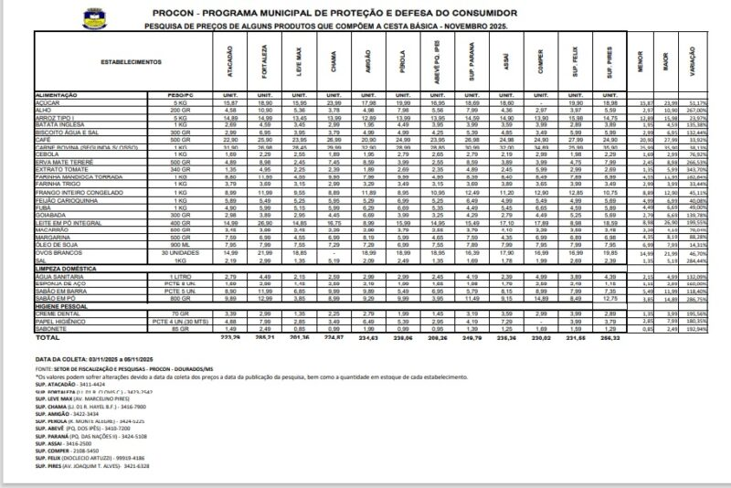 A Prefeitura de Dourados, por intermédio do Programa Municipal de Proteção e Defesa do Consumidor (Procon), realizou nova pesquisa de preços dos produtos que compõem a cesta básica. O levantamento foi feito em 12 supermercados da cidade, no período de 3 a 5 de novembro de 2025.